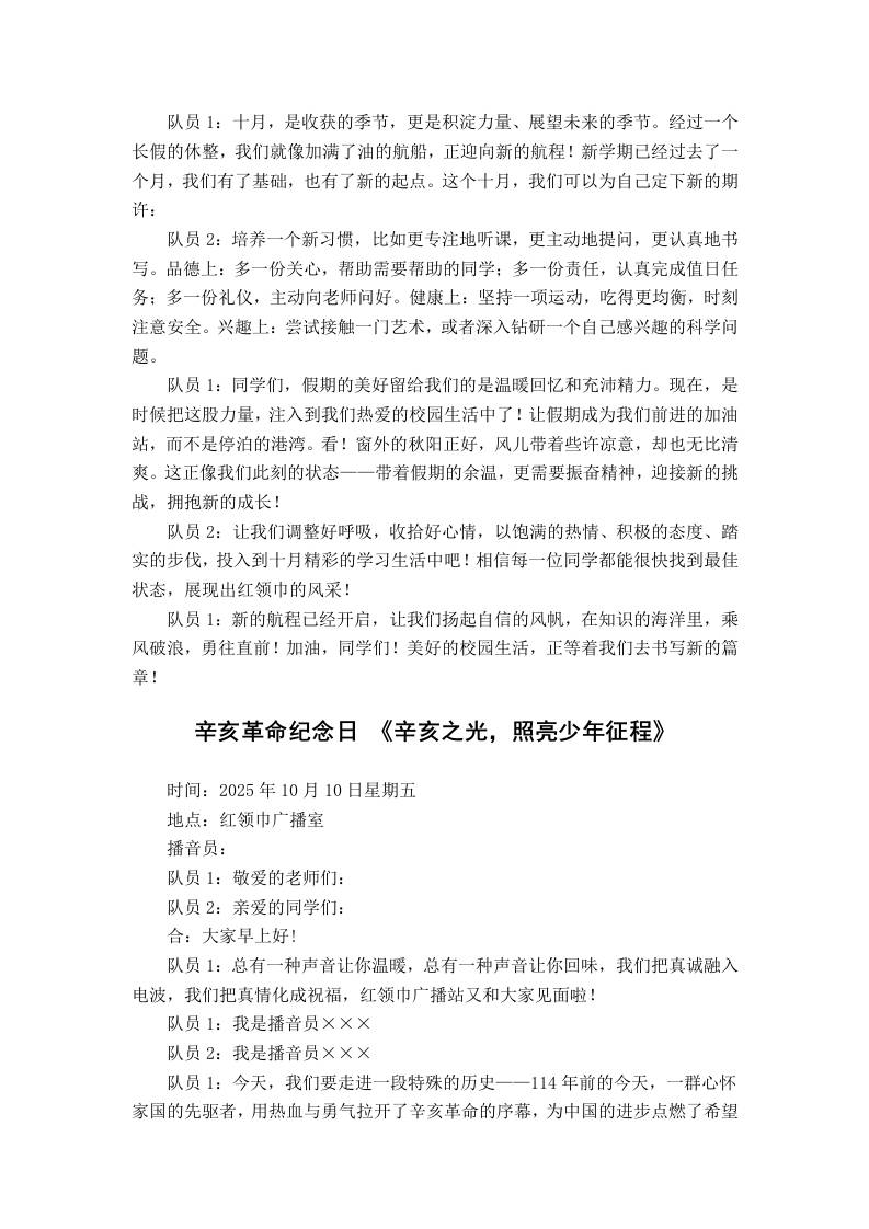 红领巾广播站2025年秋季学期第6周播稿admin15天前发布关注私信04311 ——预览已结束,还剩3页未读——开通会员后可免费下载高清完整文档 红领巾广播站2025年秋季学期第6周播稿此内容为付费资源,请付费后查看¥9.9黄金会员免费钻石会员免费暂时无法购买,请与站长联系您当前未登录!建议登陆后购买,可保存购买订单格式docx页数5 页大小18.44 KB付费资源© 版权声明文章版权归作者所有,未经允许请勿转载。THE END发言稿 喜欢就支持一下吧点赞11 分享QQ空间微博QQ好友海报分享复制链接收藏