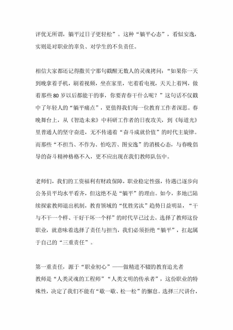2026年春季学期全体教职工大会校长讲话:拒做“躺平式教师”,以三重责任赴教育新程admin昨天发布关注私信05010 ——预览已结束,还剩3页未读——开通会员后可免费下载高清完整文档 2026年春季学期全体教职工大会校长讲话:拒做“躺平式教师”,以三重责任赴教育新程此内容为付费资源,请付费后查看¥9.9黄金会员免费钻石会员免费暂时无法购买,请与站长联系您当前未登录!建议登陆后购买,可保存购买订单格式docx页数5 页大小14.64 KB付费资源© 版权声明文章版权归作者所有,未经允许请勿转载。THE END发言稿 喜欢就支持一下吧点赞10 分享QQ空间微博QQ好友海报分享复制链接收藏