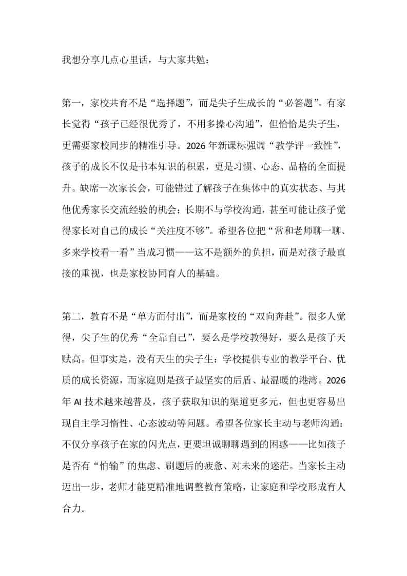 2026年春季学期尖子生家长会校长讲话:培养尖子生,就像培育一棵大树admin4天前发布关注私信04713 ——预览已结束,还剩4页未读——开通会员后可免费下载高清完整文档 2026年春季学期尖子生家长会校长讲话:培养尖子生,就像培育一棵大树此内容为付费资源,请付费后查看¥9.9黄金会员免费钻石会员免费暂时无法购买,请与站长联系您当前未登录!建议登陆后购买,可保存购买订单格式docx页数6 页大小14.69 KB付费资源© 版权声明文章版权归作者所有,未经允许请勿转载。THE END家长会(通用) 喜欢就支持一下吧点赞13 分享QQ空间微博QQ好友海报分享复制链接收藏