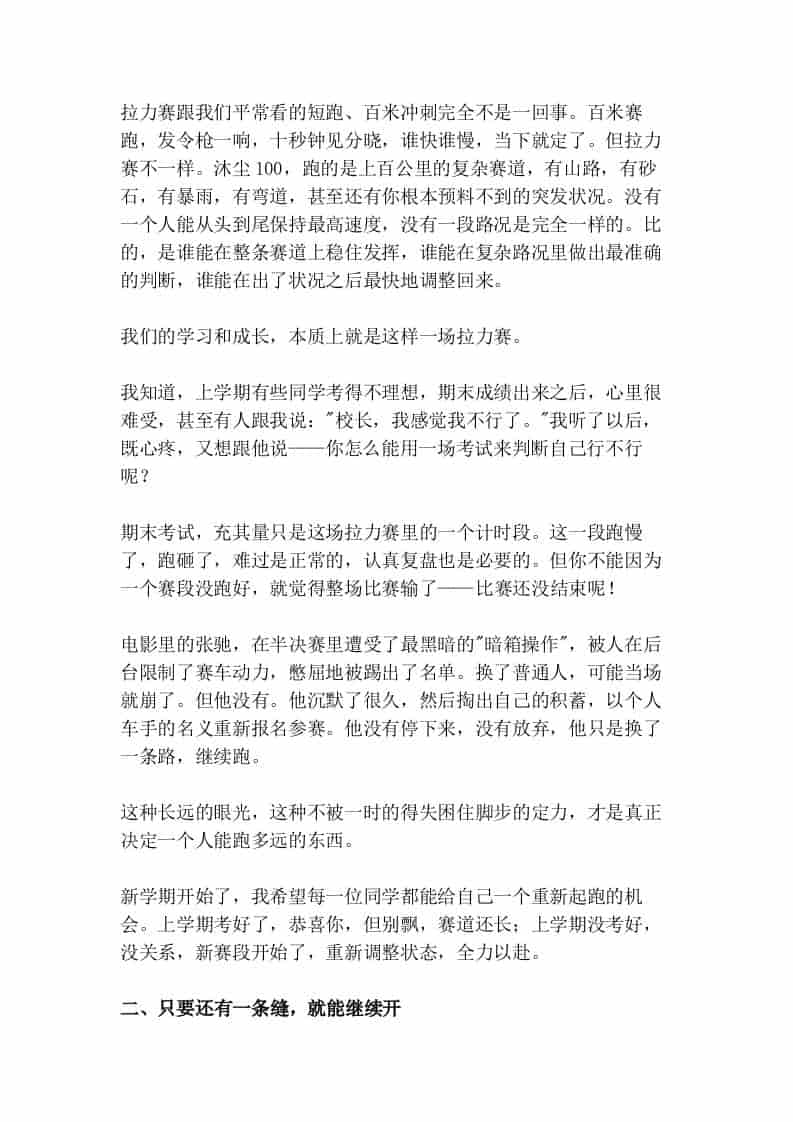 2026年春季开学典礼上,校长引用飞驰人生3的精彩讲话:热爱,才是永不熄火的引擎!admin昨天发布关注私信02410 ——预览已结束,还剩4页未读——开通会员后可免费下载高清完整文档 2026年春季开学典礼上,校长引用飞驰人生3的精彩讲话:热爱,才是永不熄火的引擎!此内容为付费资源,请付费后查看¥9.9黄金会员免费钻石会员免费暂时无法购买,请与站长联系您当前未登录!建议登陆后购买,可保存购买订单格式docx页数6 页大小16.56 KB付费资源© 版权声明文章版权归作者所有,未经允许请勿转载。THE END发言稿 喜欢就支持一下吧点赞10 分享QQ空间微博QQ好友海报分享复制链接收藏