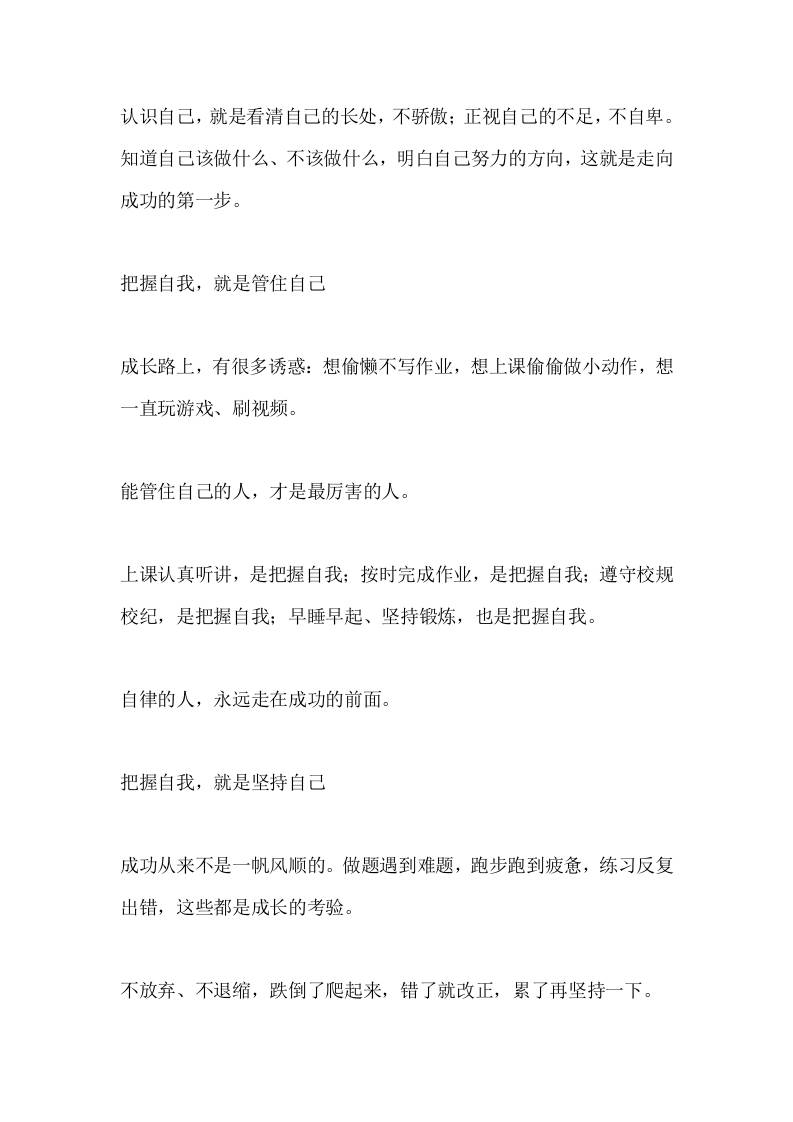 校长思政课国旗下讲话:把握自我,预约成功admin昨天发布关注私信02713 ——预览已结束,还剩2页未读——开通会员后可免费下载高清完整文档 校长思政课国旗下讲话:把握自我,预约成功此内容为付费资源,请付费后查看¥9.9黄金会员免费钻石会员免费暂时无法购买,请与站长联系您当前未登录!建议登陆后购买,可保存购买订单格式docx页数4 页大小12.13 KB付费资源© 版权声明文章版权归作者所有,未经允许请勿转载。THE END国旗下讲话 喜欢就支持一下吧点赞13 分享QQ空间微博QQ好友海报分享复制链接收藏