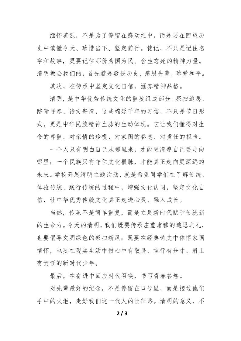 在慎终追远中涵养家国情怀——2026年清明节活动校长致辞稿admin前天发布关注私信02414 ——预览已结束,还剩1页未读——开通会员后可免费下载高清完整文档 在慎终追远中涵养家国情怀——2026年清明节活动校长致辞稿此内容为付费资源,请付费后查看¥9.9黄金会员免费钻石会员免费暂时无法购买,请与站长联系您当前未登录!建议登陆后购买,可保存购买订单格式docx页数3 页大小221.36 KB付费资源© 版权声明文章版权归作者所有,未经允许请勿转载。THE END发言稿 喜欢就支持一下吧点赞14 分享QQ空间微博QQ好友海报分享复制链接收藏