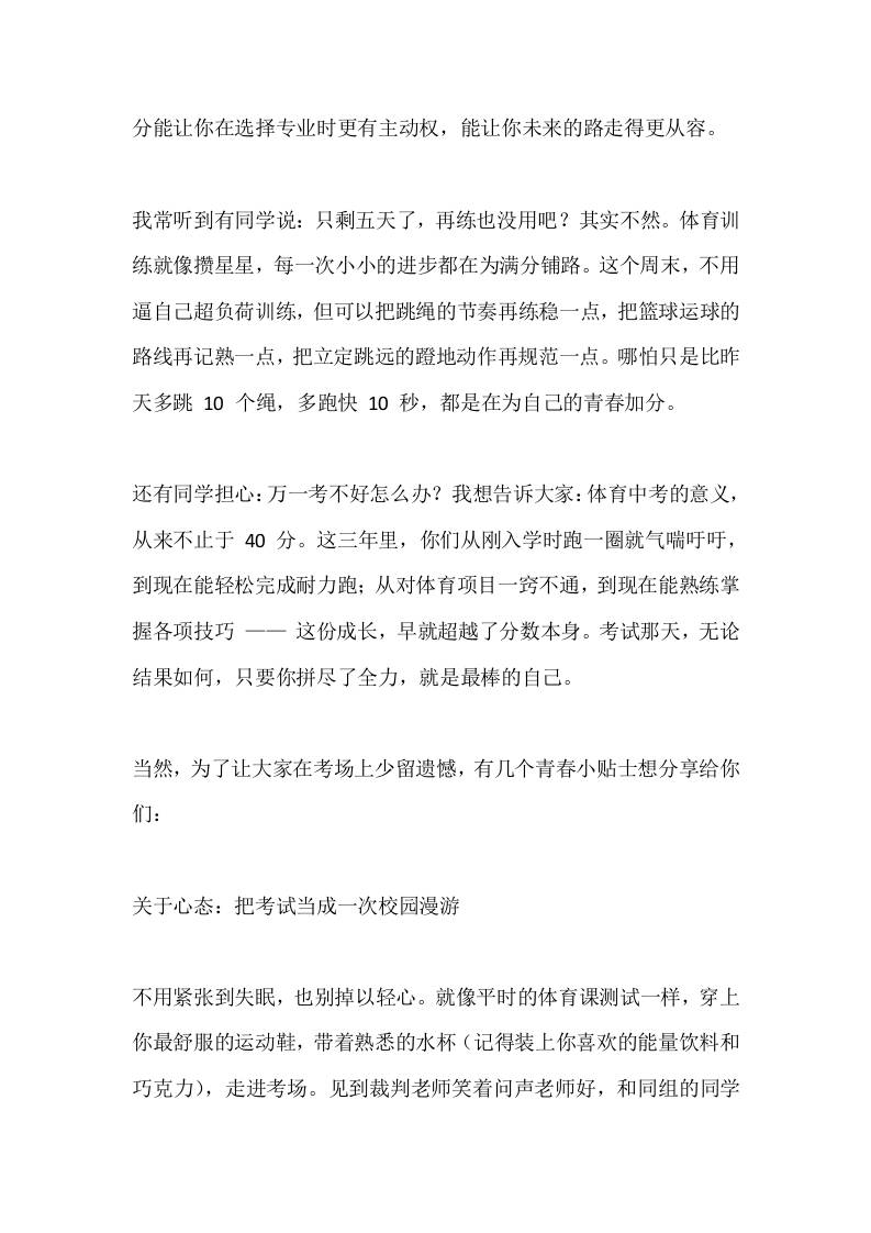 校长在体育中考动员大会上讲话:体育中考,是青春最燃的一次冲刺admin21小时前发布关注私信0295 ——预览已结束,还剩3页未读——开通会员后可免费下载高清完整文档 校长在体育中考动员大会上讲话:体育中考,是青春最燃的一次冲刺此内容为付费资源,请付费后查看¥9.9黄金会员免费钻石会员免费暂时无法购买,请与站长联系您当前未登录!建议登陆后购买,可保存购买订单格式docx页数5 页大小13.84 KB付费资源© 版权声明文章版权归作者所有,未经允许请勿转载。THE END发言稿 喜欢就支持一下吧点赞5 分享QQ空间微博QQ好友海报分享复制链接收藏