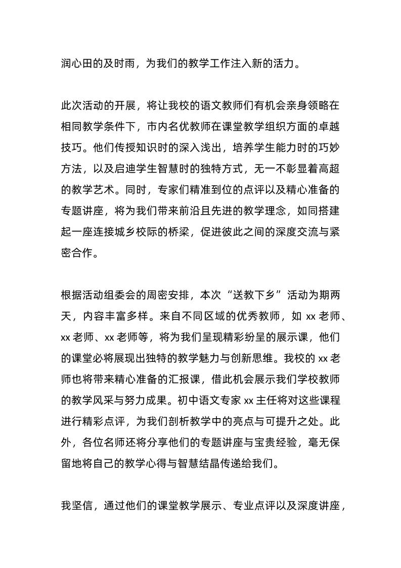 “送教下乡”活动,承办学校校长精彩发言:名师齐聚,共筑乡村初中语文教学新高度admin7个月前发布关注私信0517 ——预览已结束,还剩2页未读——开通会员后可免费下载高清完整文档 “送教下乡”活动,承办学校校长精彩发言:名师齐聚,共筑乡村初中语文教学新高度此内容为付费资源,请付费后查看¥9.9黄金会员免费钻石会员免费暂时无法购买,请与站长联系您当前未登录!建议登陆后购买,可保存购买订单格式docx页数4 页大小13.07 KB付费资源© 版权声明文章版权归作者所有,未经允许请勿转载。THE END发言稿 喜欢就支持一下吧点赞7 分享QQ空间微博QQ好友海报分享复制链接收藏