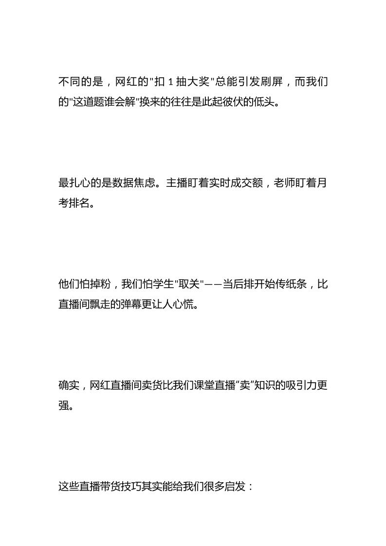 从“传统课堂”到“直播间卖货”:打造高效课堂——我的教学之路admin5个月前发布关注私信03110 ——预览已结束,还剩5页未读——开通会员后可免费下载高清完整文档 从“传统课堂”到“直播间卖货”:打造高效课堂——我的教学之路此内容为付费资源,请付费后查看¥9.9黄金会员免费钻石会员免费暂时无法购买,请与站长联系您当前未登录!建议登陆后购买,可保存购买订单格式docx页数7 页大小13.89 KB付费资源© 版权声明文章版权归作者所有,未经允许请勿转载。THE END管理相关 喜欢就支持一下吧点赞10 分享QQ空间微博QQ好友海报分享复制链接收藏
