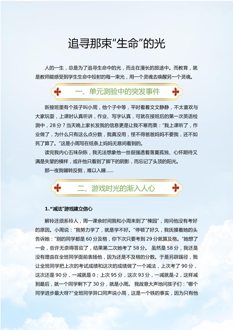 【小学】【育人故事】追寻那束“生命”的光admin5个月前发布关注私信0538 ——预览已结束,还剩4页未读——开通会员后可免费下载高清完整文档 【小学】【育人故事】追寻那束“生命”的光此内容为付费资源,请付费后查看¥9.9黄金会员免费钻石会员免费暂时无法购买,请与站长联系您当前未登录!建议登陆后购买,可保存购买订单格式docx页数6 页大小1.91 MB付费资源© 版权声明文章版权归作者所有,未经允许请勿转载。THE END育人故事 喜欢就支持一下吧点赞8 分享QQ空间微博QQ好友海报分享复制链接收藏