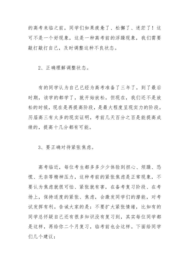 校长讲话高考想要成功,就要调整心理状态,身体状态,学习状态admin4个月前发布关注私信05415 ——预览已结束,还剩9页未读——开通会员后可免费下载高清完整文档 校长讲话高考想要成功,就要调整心理状态,身体状态,学习状态此内容为付费资源,请付费后查看¥9.9黄金会员免费钻石会员免费暂时无法购买,请与站长联系您当前未登录!建议登陆后购买,可保存购买订单格式doc页数11 页大小28.00 KB付费资源© 版权声明文章版权归作者所有,未经允许请勿转载。THE END发言稿 喜欢就支持一下吧点赞15 分享QQ空间微博QQ好友海报分享复制链接收藏