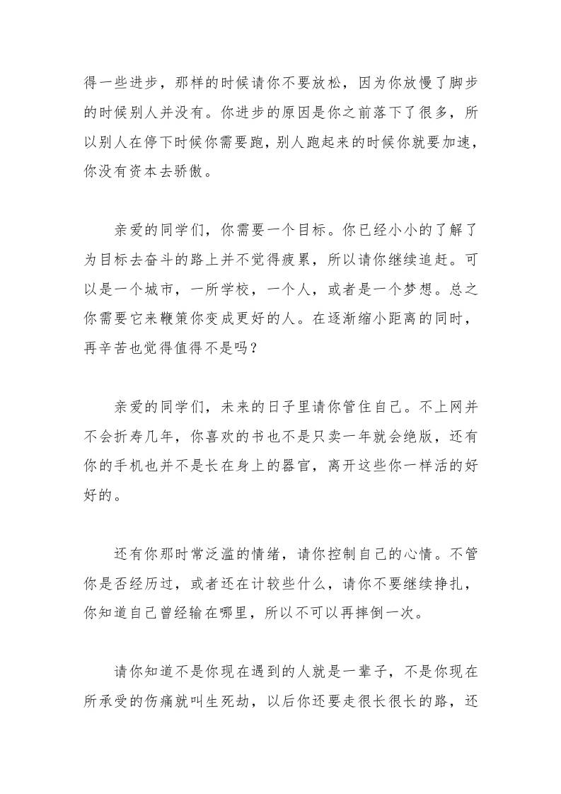 校长在中考前对初三学生讲话你没有理由也没有时间不努力了。最后一搏,只许成功,不许失败!admin3个月前发布关注私信0536 ——预览已结束,还剩2页未读——开通会员后可免费下载高清完整文档 校长在中考前对初三学生讲话你没有理由也没有时间不努力了。最后一搏,只许成功,不许失败!此内容为付费资源,请付费后查看¥9.9黄金会员免费钻石会员免费暂时无法购买,请与站长联系您当前未登录!建议登陆后购买,可保存购买订单格式doc页数4 页大小14.50 KB付费资源© 版权声明文章版权归作者所有,未经允许请勿转载。THE END发言稿 喜欢就支持一下吧点赞6 分享QQ空间微博QQ好友海报分享复制链接收藏