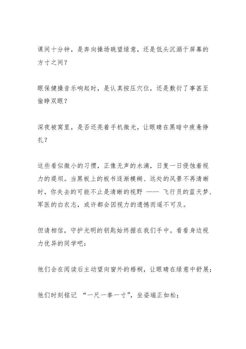 全国爱眼日,校长在国旗下讲话:守护心灵之窗admin3个月前发布关注私信04014 ——预览已结束,还剩4页未读——开通会员后可免费下载高清完整文档 全国爱眼日,校长在国旗下讲话:守护心灵之窗此内容为付费资源,请付费后查看¥9.9黄金会员免费钻石会员免费暂时无法购买,请与站长联系您当前未登录!建议登陆后购买,可保存购买订单格式docx页数6 页大小14.21 KB付费资源© 版权声明文章版权归作者所有,未经允许请勿转载。THE END国旗下讲话 喜欢就支持一下吧点赞14 分享QQ空间微博QQ好友海报分享复制链接收藏