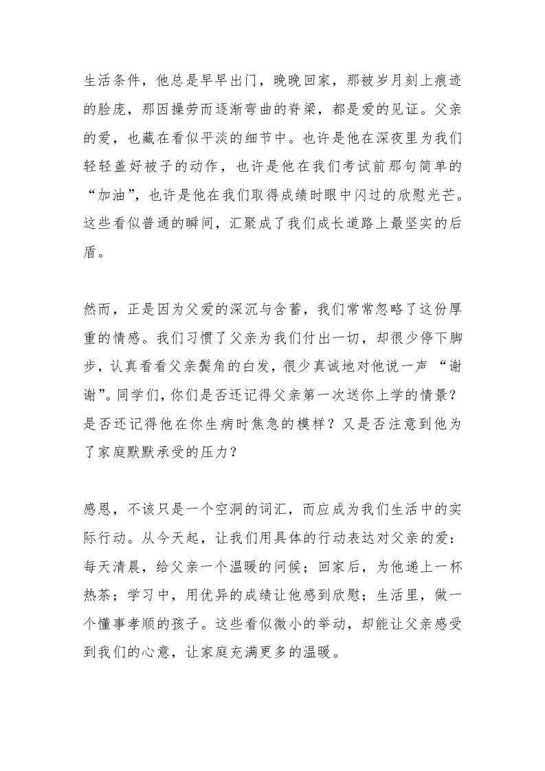 父亲节,校长在国旗下讲话:父爱如山,感恩相伴admin3个月前发布关注私信04312 ——预览已结束,还剩1页未读——开通会员后可免费下载高清完整文档 父亲节,校长在国旗下讲话:父爱如山,感恩相伴此内容为付费资源,请付费后查看¥9.9黄金会员免费钻石会员免费暂时无法购买,请与站长联系您当前未登录!建议登陆后购买,可保存购买订单格式docx页数3 页大小12.79 KB付费资源© 版权声明文章版权归作者所有,未经允许请勿转载。THE END发言稿 喜欢就支持一下吧点赞12 分享QQ空间微博QQ好友海报分享复制链接收藏
