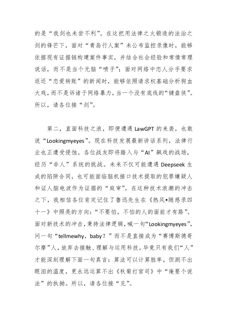 在2025届毕业典礼上的讲话:做一个善用“三神装”的法律人admin3个月前发布关注私信0347 ——预览已结束,还剩2页未读——开通会员后可免费下载高清完整文档 在2025届毕业典礼上的讲话:做一个善用“三神装”的法律人此内容为付费资源,请付费后查看¥9.9黄金会员免费钻石会员免费暂时无法购买,请与站长联系您当前未登录!建议登陆后购买,可保存购买订单格式docx页数4 页大小13.99 KB付费资源© 版权声明文章版权归作者所有,未经允许请勿转载。THE END发言稿 喜欢就支持一下吧点赞7 分享QQ空间微博QQ好友海报分享复制链接收藏