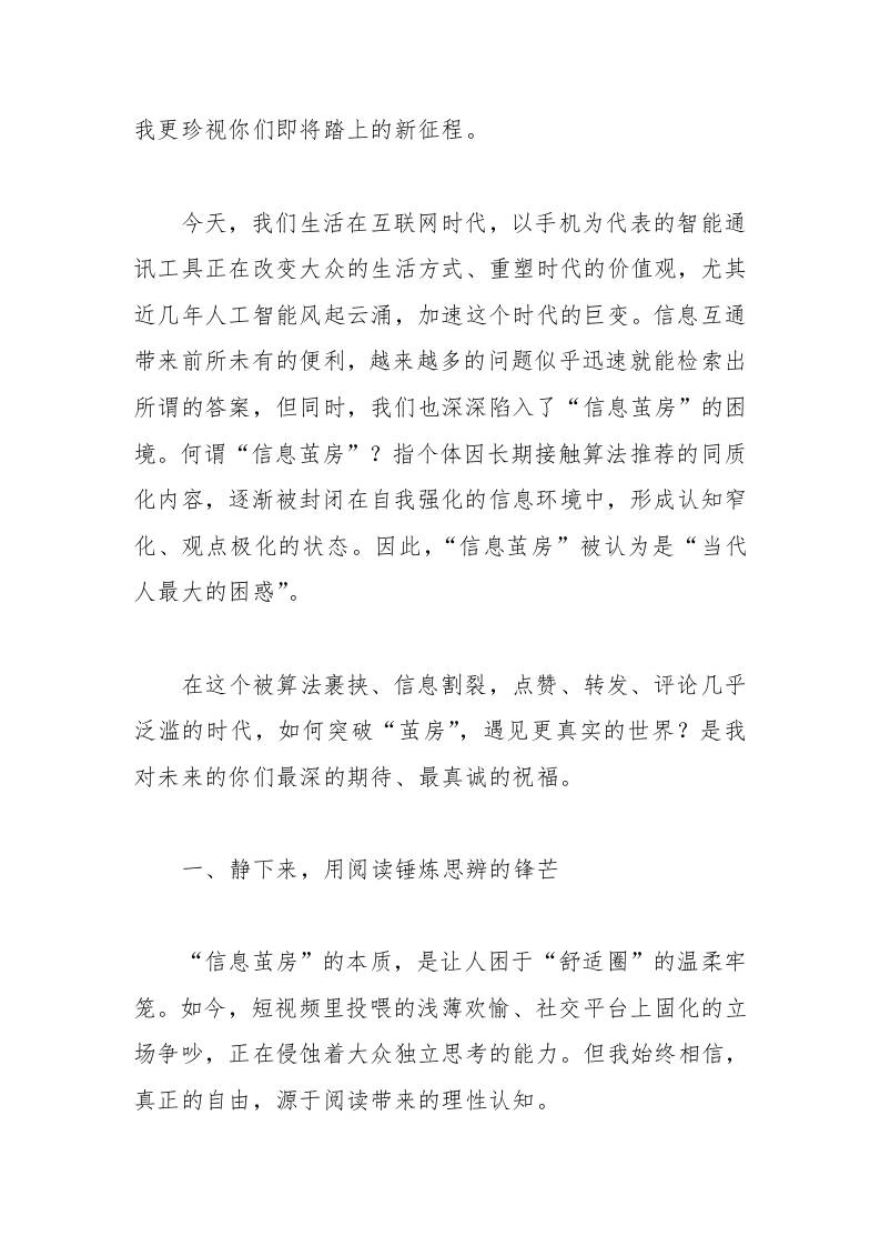 在中学2025届高三毕业典礼上的讲话:突破“茧房”,遇见更真实的世界admin6个月前发布关注私信04713 ——预览已结束,还剩4页未读——开通会员后可免费下载高清完整文档 在中学2025届高三毕业典礼上的讲话:突破“茧房”,遇见更真实的世界此内容为付费资源,请付费后查看¥9.9黄金会员免费钻石会员免费暂时无法购买,请与站长联系您当前未登录!建议登陆后购买,可保存购买订单格式docx页数6 页大小15.41 KB付费资源© 版权声明文章版权归作者所有,未经允许请勿转载。THE END发言稿 喜欢就支持一下吧点赞13 分享QQ空间微博QQ好友海报分享复制链接收藏