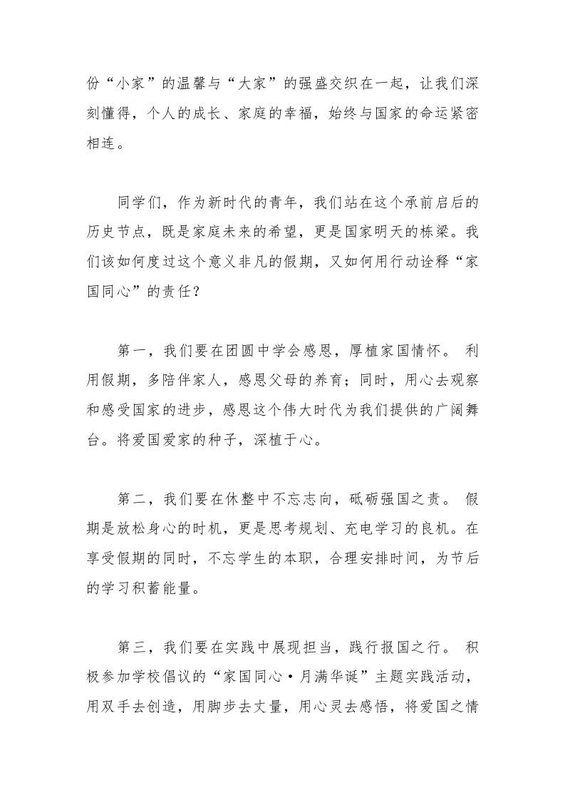 2025年中小学“国庆·中秋”双节校长讲话稿:家国同心,月满华诞,强国有我admin1个月前发布关注私信04610 ——预览已结束,还剩1页未读——开通会员后可免费下载高清完整文档 2025年中小学“国庆·中秋”双节校长讲话稿:家国同心,月满华诞,强国有我此内容为付费资源,请付费后查看¥9.9黄金会员免费钻石会员免费暂时无法购买,请与站长联系您当前未登录!建议登陆后购买,可保存购买订单格式docx页数3 页大小16.77 KB付费资源© 版权声明文章版权归作者所有,未经允许请勿转载。THE END发言稿 喜欢就支持一下吧点赞10 分享QQ空间微博QQ好友海报分享复制链接收藏