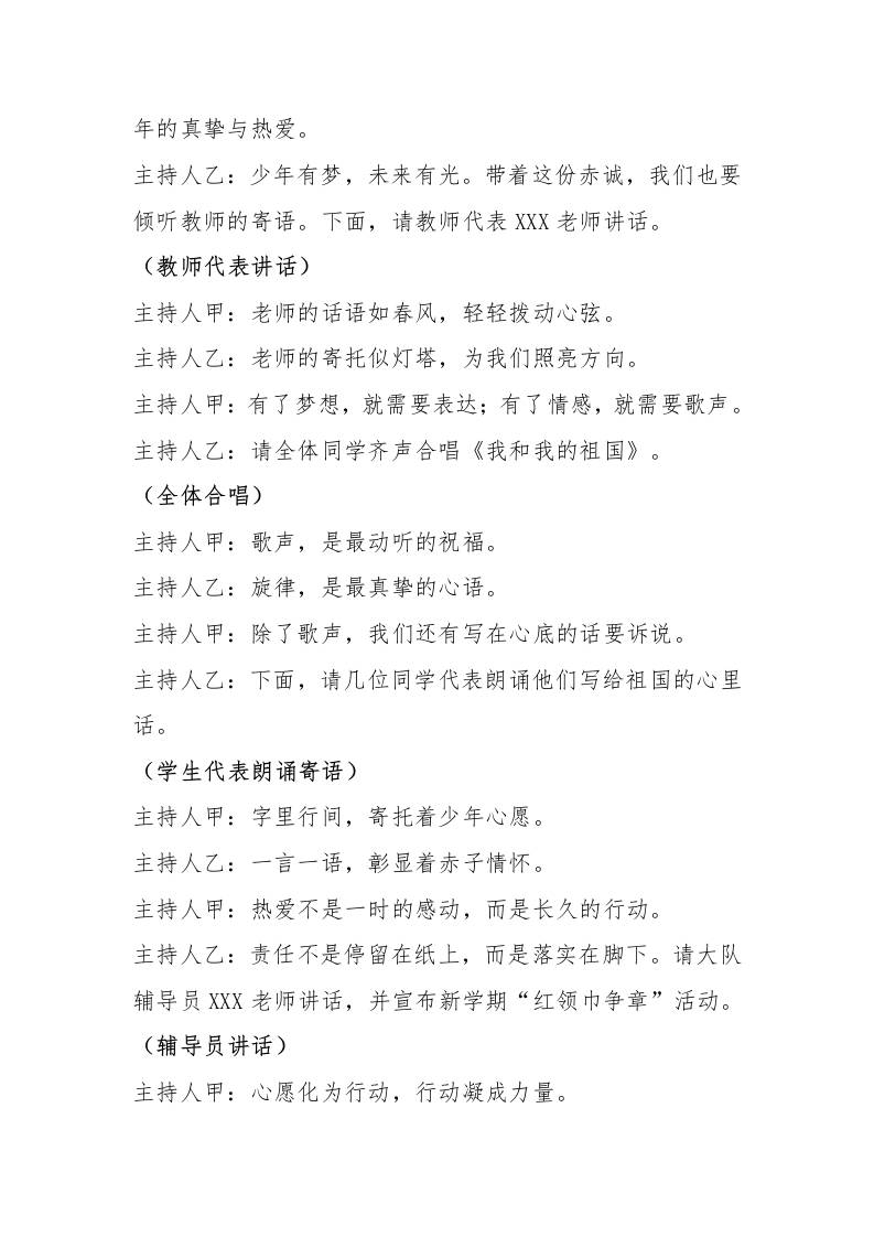 2025年国庆节升旗仪式主持词:七十六载春秋路,少年丹心映征途admin1个月前发布关注私信02415 ——预览已结束,还剩1页未读——开通会员后可免费下载高清完整文档 2025年国庆节升旗仪式主持词:七十六载春秋路,少年丹心映征途此内容为付费资源,请付费后查看¥9.9黄金会员免费钻石会员免费暂时无法购买,请与站长联系您当前未登录!建议登陆后购买,可保存购买订单格式docx页数3 页大小12.79 KB付费资源© 版权声明文章版权归作者所有,未经允许请勿转载。THE END国旗下讲话 喜欢就支持一下吧点赞15 分享QQ空间微博QQ好友海报分享复制链接收藏