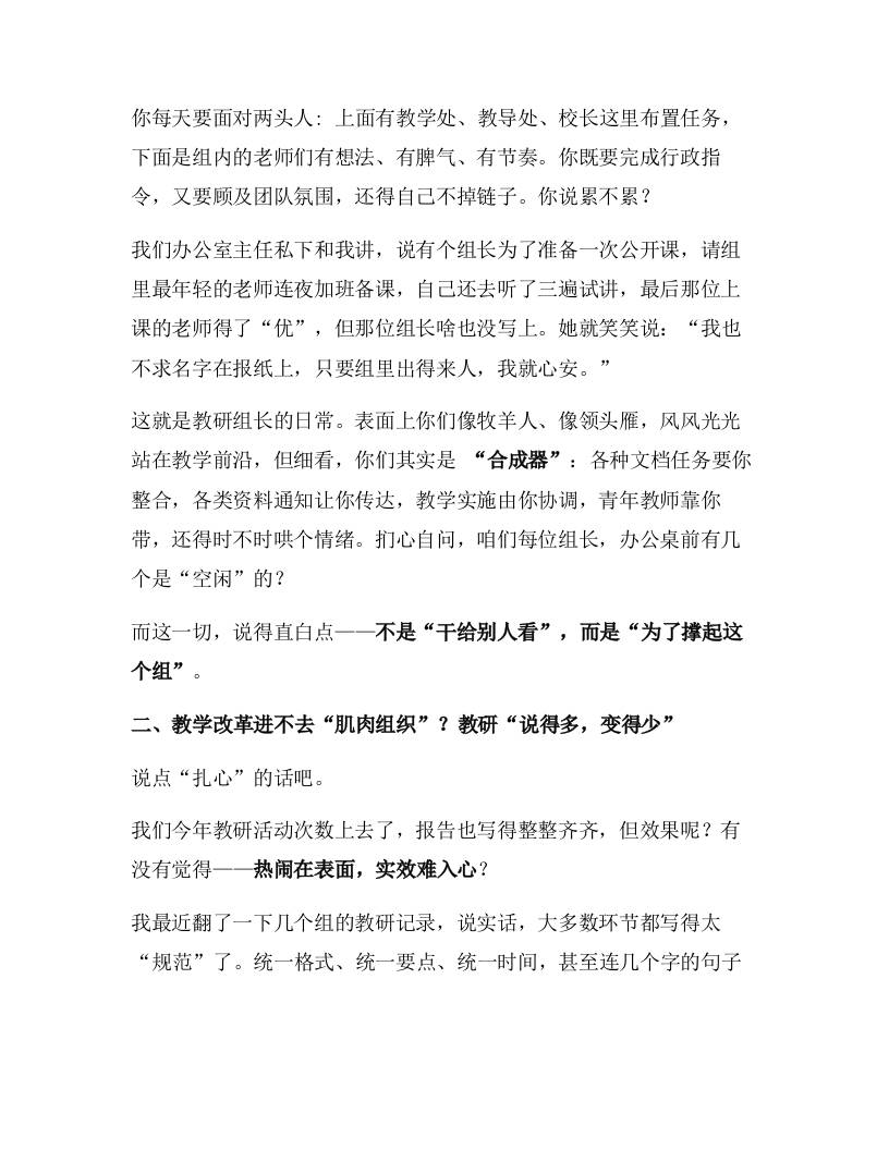 校长在教研组长会议上讲话:错错错!教研组长其实是最累的“服务员”!admin1个月前发布关注私信03010 ——预览已结束,还剩5页未读——开通会员后可免费下载高清完整文档 校长在教研组长会议上讲话:错错错!教研组长其实是最累的“服务员”!此内容为付费资源,请付费后查看¥9.9黄金会员免费钻石会员免费暂时无法购买,请与站长联系您当前未登录!建议登陆后购买,可保存购买订单格式docx页数7 页大小21.63 KB付费资源© 版权声明文章版权归作者所有,未经允许请勿转载。THE END发言稿 喜欢就支持一下吧点赞10 分享QQ空间微博QQ好友海报分享复制链接收藏