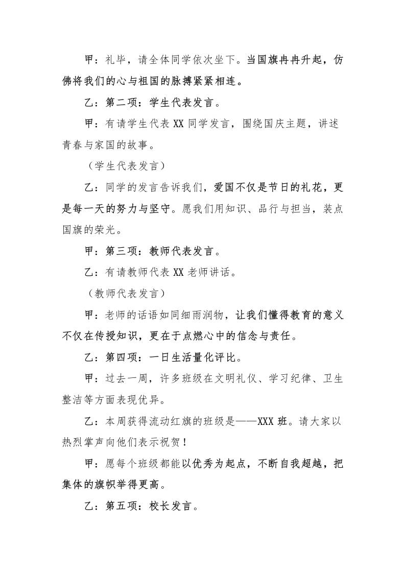 2025年秋季第一学期升旗仪式主持词(21周):第5周丹心化作朝阳色,盛世舒展五星旗admin1个月前发布关注私信02211 ——预览已结束,还剩1页未读——开通会员后可免费下载高清完整文档 2025年秋季第一学期升旗仪式主持词(21周):第5周丹心化作朝阳色,盛世舒展五星旗此内容为付费资源,请付费后查看¥9.9黄金会员免费钻石会员免费暂时无法购买,请与站长联系您当前未登录!建议登陆后购买,可保存购买订单格式docx页数3 页大小338.16 KB付费资源© 版权声明文章版权归作者所有,未经允许请勿转载。THE END国旗下讲话 喜欢就支持一下吧点赞11 分享QQ空间微博QQ好友海报分享复制链接收藏